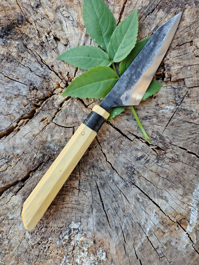 Couteau d’office finition brute de forge, acier carbone, manche en buis, ligature fil tressé polyéthylène rouge et rivet laiton.