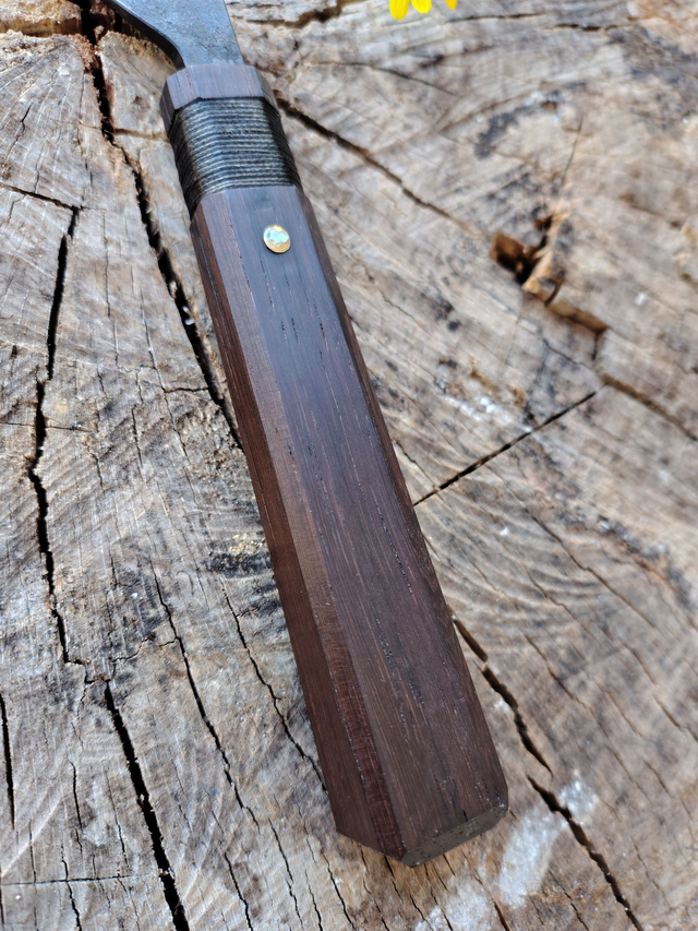 Couteau d’office finition brute de forge, acier carbone, manche en palissandre, ligature fil tressé polyéthylène noir et rivet laiton.