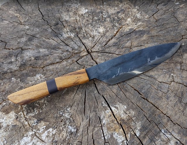 Petty finition brute de forge, acier carbone homogène, manche bi-goût en bois de serpent et insert palissandre, rivet en laiton.