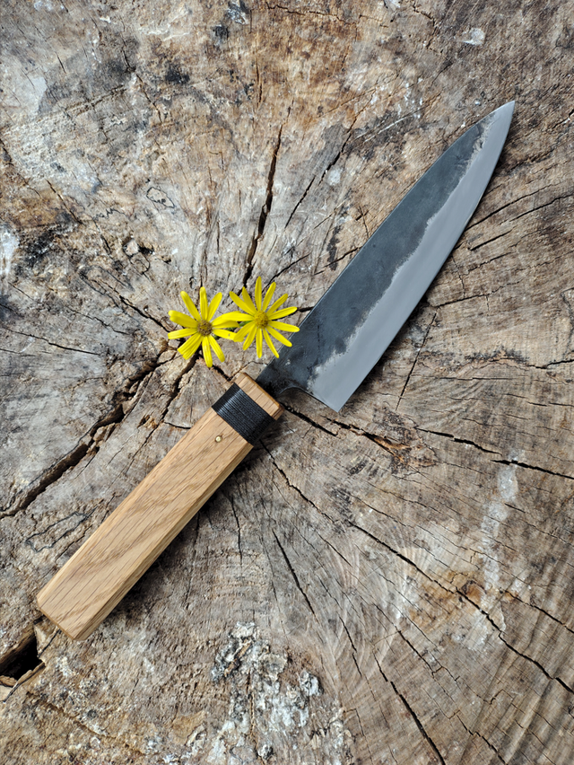 Petty knife with kurouchi finish, carbon steel, oak wood handle with black braided cord wrap, and brass rivet.