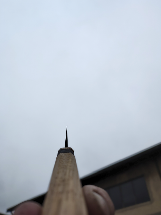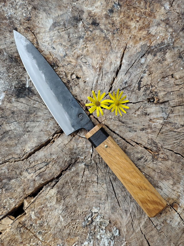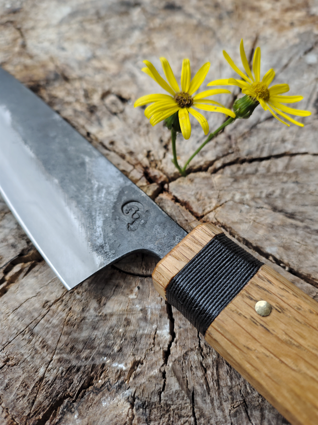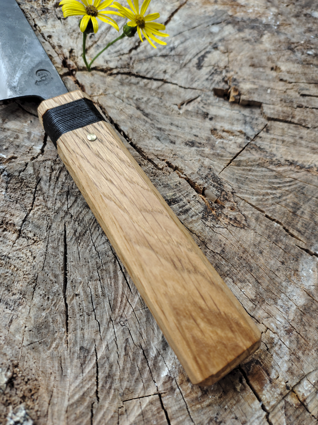Petty, finition brute de forge, acier carbone, manche en chêne de parquet, ligature fil tressé noir et rivet laiton.