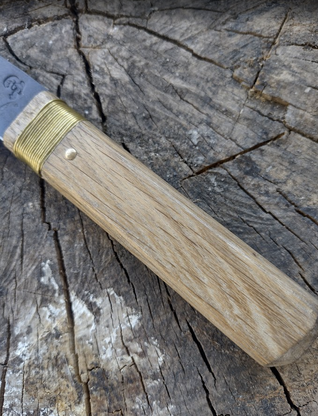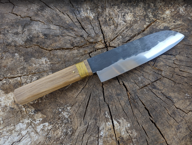 Santoku finition brute de forge, acier carbone homogène, manche en chêne de récupération issu d’un vieux parquet et rivet laiton.
