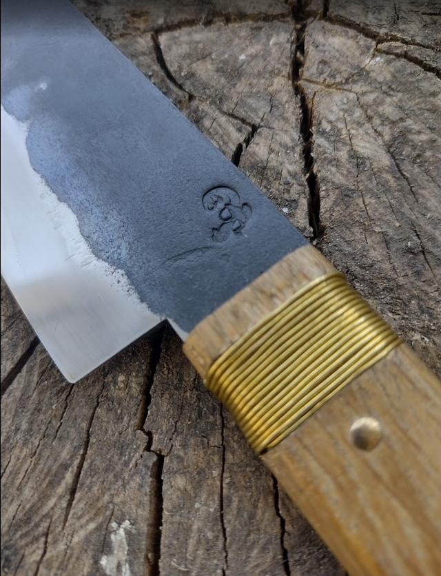 Santoku with a kurouchi finish, carbon steel, featuring a handle crafted from reclaimed oak sourced from old parquet flooring and brass rivet.