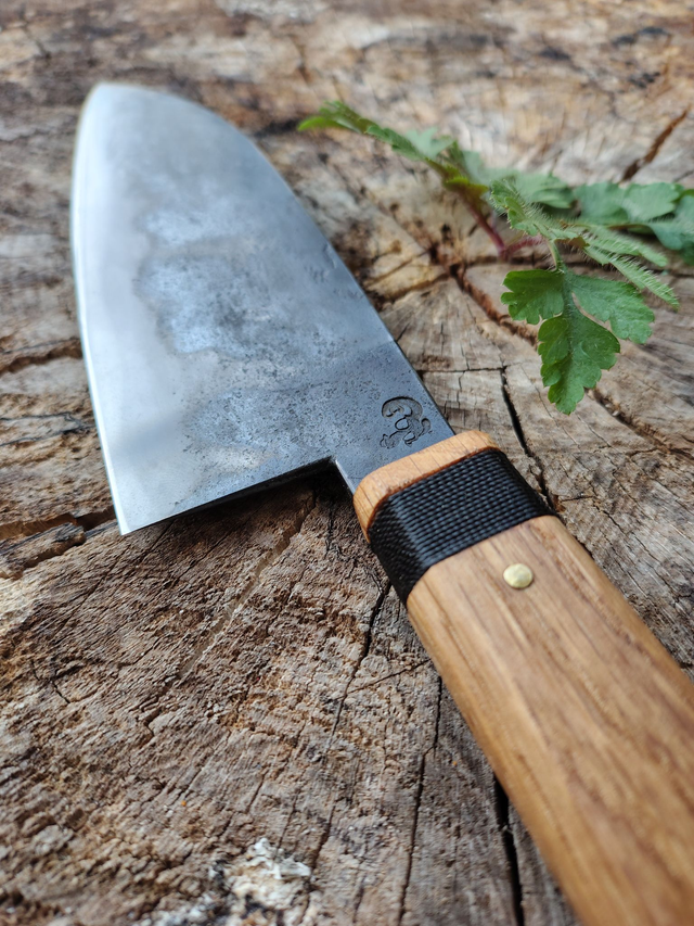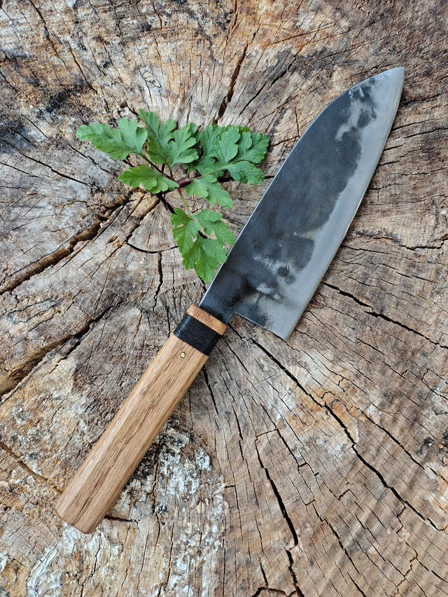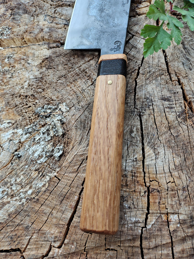 Santoku finition brute de forge, acier carbone homogène, manche en chêne de parquet, ligature polyester ciré et rivet laiton.