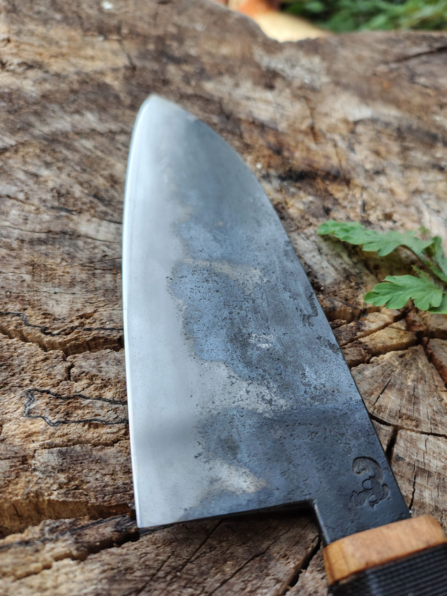 Santoku with a kurouchi finish, carbon steel, featuring a handle crafted from reclaimed oak sourced from old parquet flooring and brass rivet.